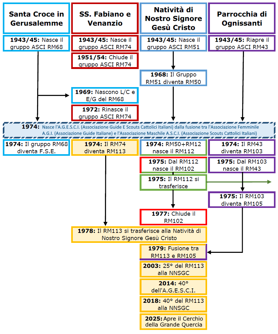 SS Fabiano e Venanzio; con la fusione di ASCI e AGI in AGESCI nasce nel 1974 il gruppo Roma113.